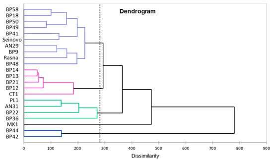 Using the presented data, UPGMA analysis was performed and a dendrogram was developed according to which 5 clusters were clearly distinguished (Figure 3).