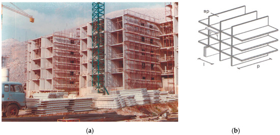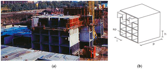 (a) Construction phase of a Cavedone building in Bologna [33]; (b) Three-dimensional scheme of the coffrage-tunnel system [34].
