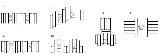 Typological plan schemes used in some Italian industrialized constructions. (a) Four in-line buildings’ schemes; (b) two in tower buildings’ schemes. Reinforced Concrete (RC) walls are represented with a thicker line.