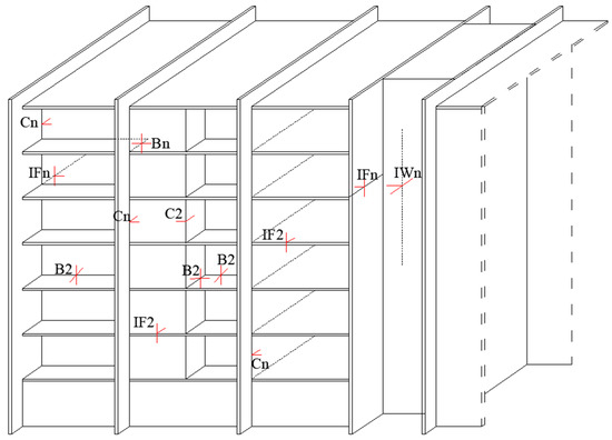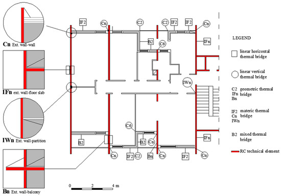 The industrialized construction of this short period was relevant, as it was built to respond quickly and at low cost to the great demand for public housing, particularly in large towns, giving rise to peripheries’ expansion (only the ZEN2 in Palermo was conceived as a settlement for 9000 inhabitants, with a volume of 380,000 m3) [36]. This building stock, like all existing buildings of the period, is particularly energy-intensive, and compared to RC frame buildings shows high heat losses due to the thermal bridges of the external RC walls. In addition, the different aggregation system of the tunnels, aligned or staggered with each other and with respect to the staircase, and the possible aggregation of tunnels of different lengths, both in the in-line and in the tower types (Figure 3), increases the dispersing surface of the RC walls, making buildings particularly energy-inefficient. In these buildings, there is a close correlation between typological-constructive elements and energy performance factors. In these type of industrialized building, specific thermal bridges were found and identified graphically in an apartment floor plan of the Sperone district in Palermo, built with the coffrage-tunnel system (Figure 4). The several thermal bridges were also divided into horizontal and vertical ones, and according to whether the thermal bridge was geometric, material or mixed [32,37]. To each of them an identifying code was given in analogy to the details in the UNI EN ISO 14683:2018, and these are reported in Figure 5 and Figure 6. The characteristic thermal bridges of the coffrage-tunnel system are as follows: header RC wall/RC floor (IFn), RC wall/balcony floor (Bn), RC wall/cavity wall (Cn) and RC wall/internal partition (IWn), not provided for in either the UNI EN ISO 14683 or in the most common atlases, and thus identified with n; other thermal bridges correspond to the IF2, B2 and C2 types of the cited international standard. Among these thermal bridges, we decided to develop a methodology for the simplified calculation of IFn, which has the highest influence on the total heat losses of the building.