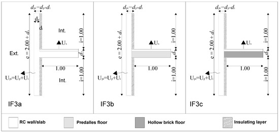 The study is based on a methodological and systematic process which, starting from the analysis of the most recurrent and relevant thermal bridges in buildings, based on RC walls, focuses on the most present one in multi-story buildings: the external wall/inter-floor slab junction, which has a greater impact, depending on the number of floors, on the total heat losses of the building. For this thermal bridge, the possible dimensional and material characteristics of the technical elements involved were identified, i.e., the thickness of the RC partition, the type and thickness of the floor, any presence and thickness of thermal insulation layer and finishes. This allowed us to identify the material and dimensional variables and to draw up a list of the most recurrent technical solutions. From studies and research previously carried out on buildings made with cast industrialization techniques, various technical solutions have been identified for the wall/inter-floor slab junction [32,33,34,38]. The survey of these buildings was at the base of an Italian Research Project, in 2008, entitled “The industrialized construction in Italy between the 1960s and 1980s. Methods and techniques of conservation and recovery”. Three categories of wall/inter-floor slab thermal bridge were identified and labeled as IF3a, IF3b and IF3c (Figure 7) in analogy to the nomenclature of the UNI EN ISO 14683:2018, which identifies as IF3 the thermal bridge between wall and intermediate floor, with an insulating layer placed inside. We considered several (n. 4) thicknesses of RC walls (dp), depending on the standard dimensions of the metal formwork used for casting, and we choose n. 3 thicknesses (ds) for floors. The technical solutions analyzed almost always provided for a layer of thermal insulation applied to the internal side of the wall with a variable thickness (di), and the case of absence of thermal insulation was also considered.