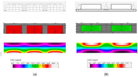 Figure 8 shows a false color diagram allowing us to identify the relationship between each color and the component’s temperature (+5 °C–+20 °C). At the same thickness and under other conditions, for energy purposes the “Predalles” floor is more efficient, the ribs being spaced higher than the hollow brick floor, and therefore the surface of the insulating material opposes the heat flow more effectively. Table 3 reports the summary of the input data used for the calculation.