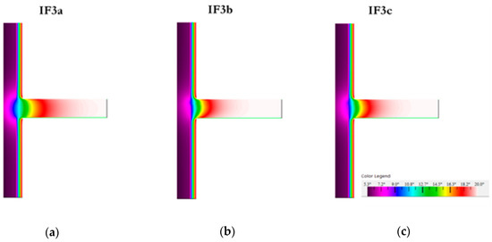 Temperature distribution (°C) in the case of (a) RC wall/RC floor junction, labeled as IF3a, (b) RC wall/“Predalles” floor, labeled as IF3b and (c) RC wall/hollow brick floor, labeled as IF3c.