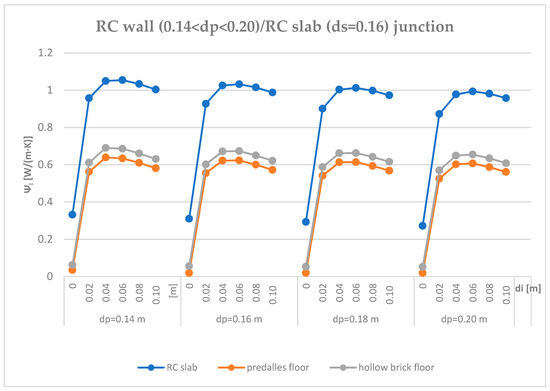 Table 4 reports the case of the thermal bridge between the 0.14 m RC wall and the 0.16 RC slab, for different thicknesses of insulation. Multiplying the linear thermal transmission coefficient by the length of the thermal bridge, the value of the increase in heat loss due to the presence of the junction is obtained.