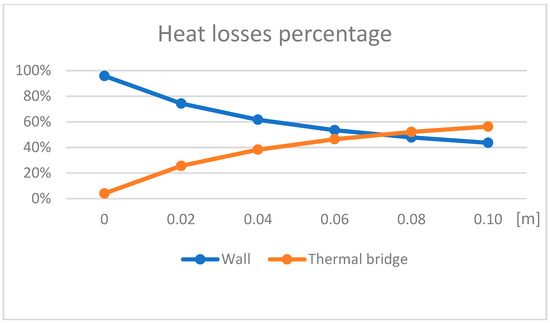 The trend of the linear thermal transmission coefficient as the thickness of the insulation varies is represented in Figure 10, showing there is a relationship between the values of ψi, the thickness of the insulation (di), the thickness (dp) and the transmittance of the wall (Up) and the thickness (ds) and the transmittance of the floor (Us). The values of ψi increase up to an insulation thickness of 0.06 m, and then decrease. This stands to indicate the low relative impact of the thermal bridge in poorly insulated buildings, relative to higher thermal insulation protection levels. For higher insulation thicknesses, more than 0.06 m, the linear thermal transmittance decreases with a small slope, showing that the absolute magnitude is only slightly affected by a further increase in the thermal insulation thickness. This trend is also confirmed by the data reported in the study of Theodosiou et al. [30] and in the PHI catalog [31]. Figure 10 and Figure 11 show the impact of the thermal bridge on the overall heat losses as a function of the thickness of the insulation. In particular, without insulation the impact of the thermal bridge is negligible (4%), while insulation produces a considerable reduction in heat losses, increasing with thickness, both through the wall and the thermal bridge, with an increasing percentage incidence of heat losses due to the thermal bridge (from 26% to 46%) up to 0.06 m of insulation, corresponding to the maximum value of ψi. From 0.06 m thick insulation, the trend changes and heat losses due to thermal bridges exceed, even if only slightly, the ones through the wall. Only in two cases (0.14 m RC wall/0.16 m Predalles and hollow brick floors) does the maximum value of ψi recur with 0.04 m insulation, with a percentage difference of 0.6–0.8% with the corresponding value at 0.06 m insulation. Therefore, we consider these two cases negligible. The value of ψi increases as the thickness of the wall and the thickness of the floor increases, and decreases as the type of floor varies, from slab to hollow brick floor to “Predalles”. In terms of cost-effectiveness, considering the costs of rigid rock wool panels for internal partition wall insulation, with thermal conductivity of 0.034 ·(m·K), which is compliant with UNI EN 13162, picked up by the regional price list of Lombardy [45], the base cost only for material, without considering the labor costs and the cost of adhesive material for affixing the panels to the wall, is 3.18 EUR/m2 for a 20 mm panel, and increases of 1.00 EUR/m2 per every 10 mm additional thickness. Thus, the economic impact of this type of thermal insulation varies between 5.18 EUR/m2 and 7.18 EUR/m2, for 40–60 mm thicknesses.