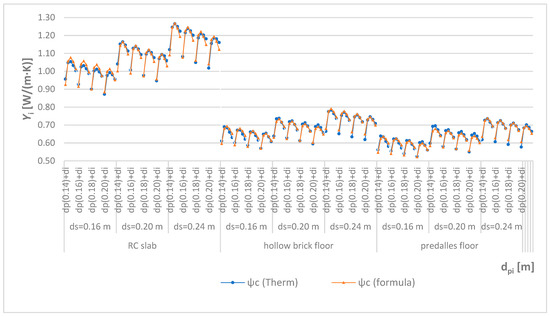 By applying the Equation (4) to the 216 case studies examined, a maximum percentage variation of 4%, as reported in the Table A1 of Appendix A, was verified between the data calculated by means of THERM 7.4. Figure 12 shows the data derived by the calculation of ψi by THERM 7.4 and the application of Equation (4).