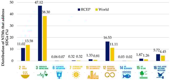 The implementation of NTMs often serves important purposes, such as protecting human health, ecosystems, and the environment. In addition, the 2030 Agenda for Sustainable Development recognizes international trade as an engine for inclusive economic growth and poverty reduction, and thus, several NTMs have been imposed to help achieve the sustainable development goals (SDGs) [3]. Figure 1 depicts the shares of NTMs that address several SDGs for countries in the Regional Comprehensive Economic Partnership (RCEP) (the RCEP is a proposed regional free trade agreement among the ten member states of the Association of Southeast Asian Nations (ASEAN) and five Asia-Pacific countries, namely, Australia, China, Japan, New Zealand, and South Korea [4]) and at the global level. The figure shows that most NTMs address SDG 3 (good health and well-being), 12 (responsible consumption and production), 2 (zero hunger), and 16 (peace, justice, and strong institutions). SDG 12 has been classified as one of the three most comprehensive measures to enhance sustainable development [5]. The distribution of NTMs shows that policymakers have acknowledged that fundamental changes in the way societies produce and consume are crucial for achieving global sustainable development [6].