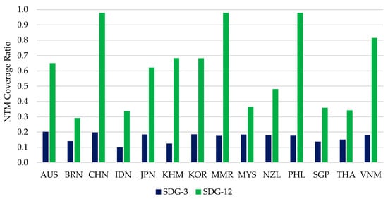 where the dummy variable, denoted D, reflects the existence of at least one SDG k-related NTM in country j for product p; V denotes the import value of product p in country j; p represents the HS 6-digit product; and n represents the HS 2-digit sector. k represents an SDG, with this study focusing on the 2 most common SDGs: 3 (good health and well-being) and 12 (responsible consumption and production). It is important to note that SDGs are not independent, as some goals are closely linked [46]. This study focus on two different SDGs, as SDG 3 addresses the issue of efficient allocation, while SDG 12 addresses the issue of fair distribution [47]. Thus, this study avoids interdependency issues. By using Equation (1), this study calculates the coverage ratios for NTMs that are related to specific SDG coverage ratios at HS 2-digit level, which can be interpreted as descriptive statistics for NTM incidence in relation to coverage (NTM exposure in the total import share) with respect to each SDG.