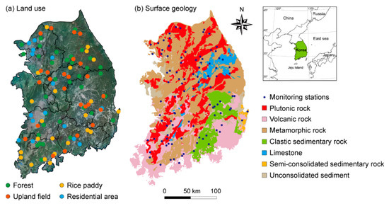 Figure 1. (a) Map showing land use (solid circles) for each monitoring station of GQMN (n = 97). Land use types were investigated at the time when monitoring stations were installed. The background is a satellite image of Korea. (b) Surface geology of the country (modified from Bacal et al. [20]). Solid circles indicate each monitoring station.