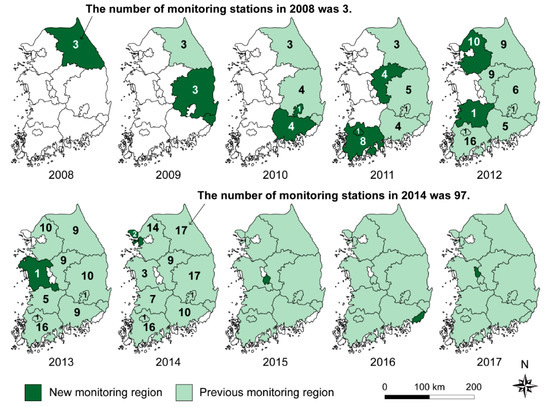 We collected groundwater quality data from 289 monitoring wells at 97 monitoring stations for the duration 2008–2017 (number of data (n) = 6405 for each parameter). The data used in this study were from monitoring stations of GQMN installed in background regions. Groundwater quality depends on the location of monitoring stations [14,17]. Thus, we examined their locations with the different installation dates. The number of monitoring stations increased steadily each year after installation of the wells, from only three monitoring stations in 2007 to 97 stations in 2016, covering all administrative districts of the country since 2017 (Figure 2). Twelve groundwater quality parameters were selected to study the hydrochemistry including: temperature (T), pH, electrical conductivity (EC), oxidation reduction potential (Eh), calcium (Ca2+), magnesium (Mg2+), sodium (Na+), potassium (K+), bicarbonate (HCO3), chloride (Cl), sulfate (SO42−), and nitrate (NO3). The eight parameters (Ca2+, Mg2+, Na+, K+, HCO3, Cl, SO42−, and NO3) are indicative of geochemical evolutions including water-rock interaction, ion exchange, etc. In the meanwhile, the distribution and trend of Na+, Cl, SO42−, and NO3 can be analyzed to determine whether groundwater is contaminated by natural or anthropogenic factors. The four parameters (T, pH, EC, and Eh) are measured in the field site as they are sensitive to redox conditions.