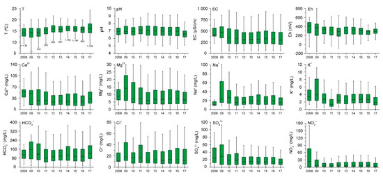 Statistical analyses were done for the groundwater quality parameters. Box-whisker plots of the 12 parameters were generated to see the data variations during the studied time period (Figure 4). All parameters showed small to large variations in values monitored in different years. The average coefficient of variance (CV), which shows the extent of variation in particular dataset, for the mentioned groundwater quality parameters was 3.57 (Table 1). Six parameters—EC, Ca2+, Mg2+, Na+, K+, and Cl—had high CV (>3.57) and showed higher variance in different years (Figure 4). Other parameters—T, pH, and Eh—had fluctuating values with no major variance in the data values during the studied period. However, NO3 revealed a clear decrease in the variance after 2008. This change seems to be affected by the implementation of restricted fertilizer amounts in agricultural areas and sustainable agricultural activities [35]. Groundwater quality parameters with high CV have displayed longer boxes with lower minimum and higher maximum values. In addition, those six parameters were considered as the indicators of groundwater contamination by seawater intrusion [36]. In 2009 and onwards, those parameters showed an increase in the variance which might be linked to the installation of Pohang monitoring station in coastal area in the same year 2009.