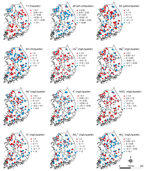 For trend analysis, linear regression slopes were applied to the decadal data of groundwater quality parameters (Figure 5). Percentage of groundwater data with increasing and decreasing trends was presented in Table 2. Among water quality parameters, T, EC, Ca2+, Mg2+, HCO3, and Cl had dominating percentages for the increasing trends while, for pH, Eh, Na+, K+, SO42−, and NO3, a decreasing trend dominated over the increasing trend. The countrywide spatial distribution of temporal trend (linear regression slope results) of groundwater quality parameters is given in Figure 5. For groundwater T, an increasing trend was observed in the northeast and southwest, whereas a decreasing trend was found in the northwest. Air temperature was steadily increasing due to changing climate which can increase the groundwater T. Statistically, the pH exhibited predominant decreasing trend throughout the national scale. However, the median of variation is −0.02 (Table 2), and it seems to be changed little.
