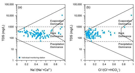 Changes in land use may cause variations in the groundwater quality of the country. Anthropogenic influence on groundwater quality is described in Section 3.4.1, Section 3.4.2 and Section 3.4.3, representing high ionic concentrations in particular land use areas. Meanwhile, Gibbs diagrams provide basic information on natural factors that influence hydrogeochemical evolution [45]. The evolution starts from the Ca-HCO3 water type because most of geology constituting aquifers contain silicate or carbonate minerals [46]. Sometimes the hydrochemistry can be affected by saline water (seawater, coastal river, and evaporative lakes) [47]. Thus, water samples shown in the upper right of the diagram are indicative of this effect. Meanwhile, when precipitation water infiltrates into groundwater, thus water is plotted at the lower part of the diagram because dilution and mixing of the precipitation and groundwater occur, and the TDS value becomes low [46].