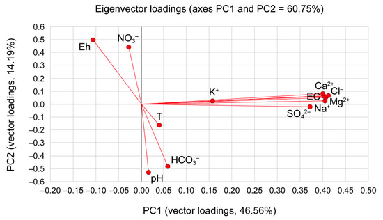 Another statistical technique, PCA, was applied to the water quality data to reduce dimensionality of interrelated parameters [12]. Statistical PCA analysis was applied to groundwater quality parameters: T, pH, EC, Eh, Ca2+, Mg2+, Na+, K+, HCO3, Cl, SO42−, and NO3 monitored during the studied period, to identify the parameters with the greatest clarifying power that control the hydrochemistry of the groundwater. The results were obtained in the form of principal components (PCs), having eigenvalues >1 and explained the different variances (Table 6).