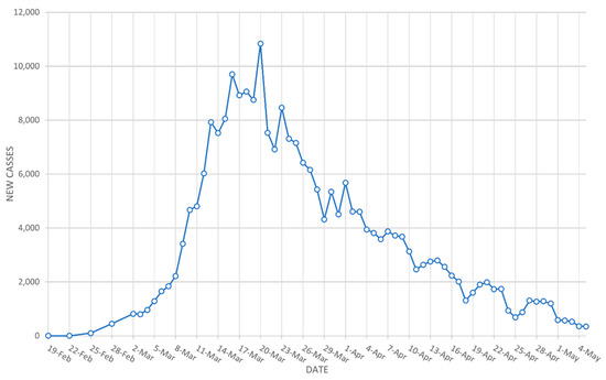 The first case in Spain was discovered on 24 February, and nearly one month later, on 14 March, approximately 8000 new daily cases were reached. By 18 March, just four days later, the country augmented its daily rate of new cases from 8000 to 9000. This trend continued until 20 March, when more than new 10,000 daily cases were registered, which was precisely the turning point and the peak of the daily cases curve in Spain. Thereafter, the curve started to decrease, with fewer than 6000, 4000 and 2000 new daily cases reported on 7 April, 11 April and 25 April, respectively, as can be seen in Figure 2.