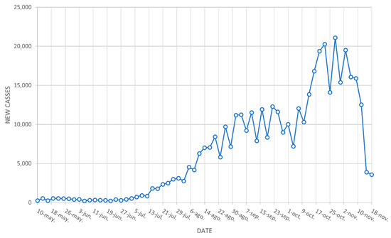 Figure 3 shows the daily new cases from May to November. The maximum rate of new daily cases was reached on October 27, with more than 20,000 new daily cases. The maximum rate in the previous semester was approximately 10,000 new daily cases confirmed.