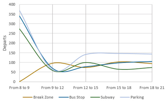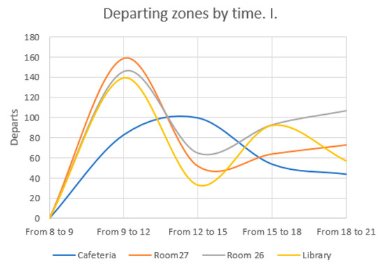 Figure 5 and Figure 6 allow showing hotspots by time steps. From 8:00 to 9:00, most people leave from Rooms 27 and 26, whereas that tendency decreases throughout the day. A new hotspot is detected in the restaurant, where most people quit this space from 12:00 to 15:00. Focusing on Figure 5, it is obvious that means of transports are the busiest departure zones from 8:00 to 9:00, although graphical data in Figure 6 show that there is new growth from 12:00 to 15:00 h, especially in private transport systems.
