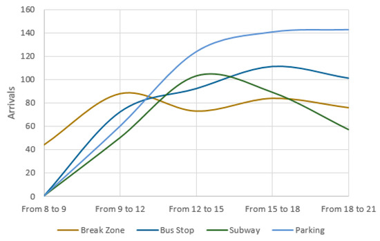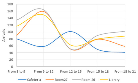 In the same way, it is possible to analyze hot spots in terms of arrivals. Figure 7 and Figure 8 show that Room 26 has the most elevated attraction value from 8:00 to 9:00; however, from 9:00 to the end of the working day, this position is occupied by parking. At midday, arrivals to the restaurant increase, and the trend diminishes from that period to the end of the day.