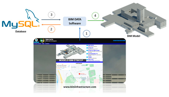The collected information is inserted into a SQL database, articulated with the O-DM tables, which creates a daily basis graphical information that is represented inside the BIM model by a specifically developed program based on different programming languages. The information flows from the website to the final BIM model following the number sequence presented in Figure 10.