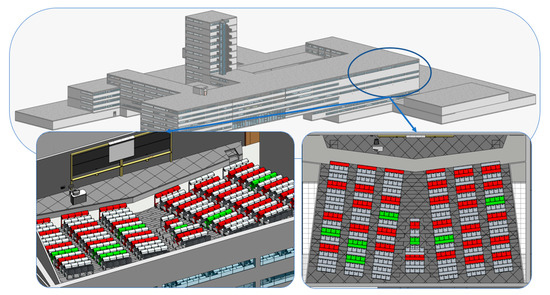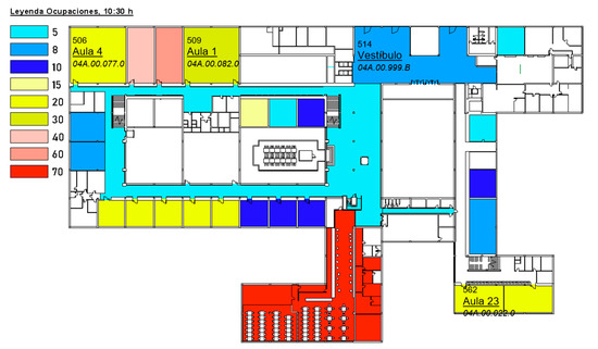 One of the possible measures in the educational sector to be implemented by the Spanish government is aimed at reducing the maximum number of students per room. In infrastructures such as the campus of ETSICCP, many degrees are imparted, and synchronization of all elements, schedules, teaching staff and new student locations is quite complicated. Only a global visualization of the teaching schedules can provide the required information to the management staff of the total occupied rooms and the free spaces available to redistribute the students. An example of internal infrastructure visualization is provided in Figure 12.