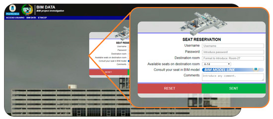 The BIM-FM system was designed to permit synchronization to book a seat for a specific hour. It also permits checking any parameter of the infrastructure, such as lockers or parking space availability. The challenge was to manage such facilities by a single accessible system, avoiding the initial rejection of the users to manage more than one system for each parameter [10]. That is to say, the system developed in this study permitted hosting tasks with data coming from quite a different structure and origin. To do so, the software developed links the BIM model with the most relevant management tasks that were traditionally managed from separated formats. Moreover, this was achieved through a user-friendly Internet page.