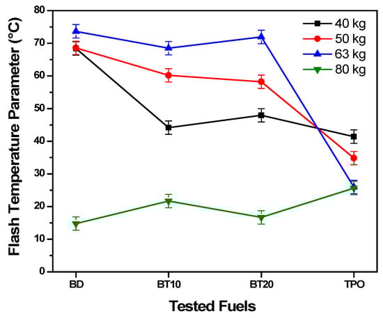 The result of tested fuels on the flash temperature parameter (FTP) is presented in Figure 5. Strong lubricating efficiency and a low chance of lubricant layer breakdown lead to a high FTP value. The temperature at which a lubricating layer can be formed to enhance lubricity is flash temperature. A higher FTP value leads to better lubricating performance and reduced risks of lubricant film breakdown [47]. The FTP value for each tested fuel rises with a reduction in the wear load. The findings show that the load increase appears to increase the worn surface’s WSD as well and FTP is inversely proportional to wear scar diameter [48]. Compared to other fuels, TPO displayed the highest FTP of 25.67 °C at 80 kg load. The better FTP results are shown by BT10 and BT20 and that is similar to biodiesel fuel. However, biodiesel fuel (14.77 °C) has been credited with the lowest FTP rating at 80 kg, because of the biodiesel deterioration. Hence, the contact surfaces surround each other and enhance the surface of the contact [49].
