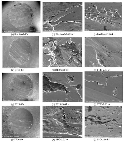 Tested ball worn surfaces were characterized by scanning electron microscopy (SEM) to understand the anti-wear behaviour of considered fuel samples. The related worn surfaces were also analysed using SEM, TPO showed better wear prevention at higher loads (80 kg). For the fuel samples tested, Figure 6a–l displays the SEM micrographs of the worn surfaces of the tested balls under 80 kg. The micrographs of the biodiesel showing adhesive wear and rough surface area as clear in Figure 6a–c above the TPO blended samples Figure 6d–l. Similarly, the least material removal is presented in Figure 6d–f relative to Figure 6g–l. For all tested fuels, the surface wear is greater than 20 μm, thus representing adhesive wear [50]. As the TPO blend ratio increases, the wear scar diameter leads to an increase. The SEM images also demonstrate that the metal layers are separated from the surfaces in the direction in which the spinning ball rotates. Wain et al. reported that [44] the alternative fuels that have oxygen content may contribute to lower diesel engine emissions but compared to higher sulphur fuels, they may also have lower anti-wear properties.