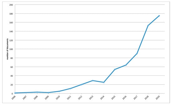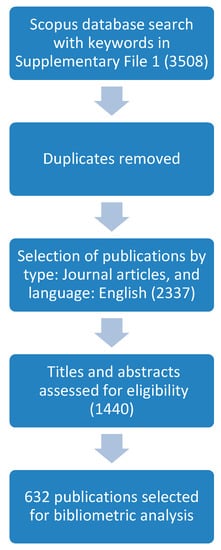 We obtained the publications considered for this study from the Scopus database through a systematic process as shown in Figure 1. Scopus was chosen because it is a recognized index with a wide coverage of peer-reviewed publications and provides reliable bibliographic data [24,34]. Several search queries with relevant keywords were used (see Supplementary File S1) to search in the title, abstract, and keywords of the publications in the database from 2005 to 2019. The year 2005 was chosen as the start date because most of the previous reviews reported the first publications in this area to be from 2007 or later. Two years were added to this to ensure that all relevant documents were found. We filtered the results to include only publications in English and journal articles, resulting in 1440 documents. Their titles and abstracts were reviewed, and we selected 632 relevant publications. We selected theoretical and empirical articles on the application of online reviews in tourism and hospitality, with an emphasis on studies that used online review data and excluded technical papers focused on highlighting the performance and accuracy of algorithmic models for prediction, classification, recommendation engines, or detection of fake reviews.