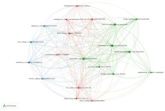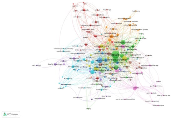 The most frequent keywords, such as “online reviews,” “social media,” “eWOM,” “UGC,” and “online ratings,” had the biggest sizes. To avoid labels from overlapping, VOSviewer does not display labels close to a bigger label in the static image of the map, which prevents some keyword labels from showing. Hence, these oft-recurring keywords that cut across the entire field adding no extra information were removed from the visualization to simplify it and reveal the structure of the field spatially [33].