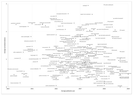 Many of the keywords from the co-word analysis are visible in Figure 5, including those that could not be seen on the co-word network map to avoid overlapping. They include keywords about the industry sectors, consumer behavior, management processes to achieve management objectives, online review platforms, research methodologies, and country/city names. The closer to the right side of the plot the keyword appears, the more recent its occurrences in the literature are, and the closer to the top of the plot, the better cited (normalized citations) the articles are that used the keyword. Keywords found to the bottom right of the plot are emergent in the literature, while those at the top right are recent and well cited or hot topics [56].