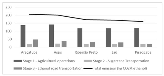 Fuel consumption during machine and truck operations in the field (“Stage 1–Agricultural management”) accounts for most of the emissions from the logistics stages analyzed in the study region. On average, agricultural management operations emit approximately 127 kg CO2/t ethanol, accounting for 70% of total CO2 emissions from biofuel logistics. The region with the lowest emission levels in stage 1 is Ribeirão Preto, with approximately 117 kg CO2/t ethanol. Conversely, the ethanol-producing region of Assis has the highest emission levels according to the calculations, approximately 142 kg CO2/t ethanol. The following factors are some of the determinants of this difference in emissions from the field: natural factors (including terrain and soil characteristics), type of production system adopted (number of rows, for example) and characteristics of the machines and trucks used (including age, state of conservation and yield), among others.