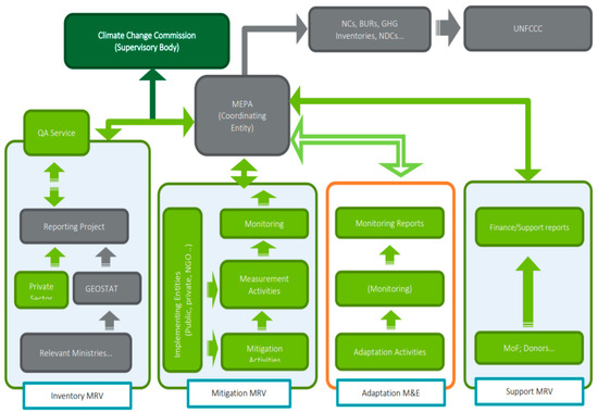 Formal Institutional Framework for Georgia’s National Measurement and Reporting (M&R) system (current and proposed combined. MEPA refers to the Ministry of Environmental Protection and Agriculture). Figure 1 [34]: Grey-colored boxes are elements that are currently in place. Light green boxes are elements deemed necessary for a holistic M&R system. Dark green boxes are proposed additional elements that could strengthen the system further.