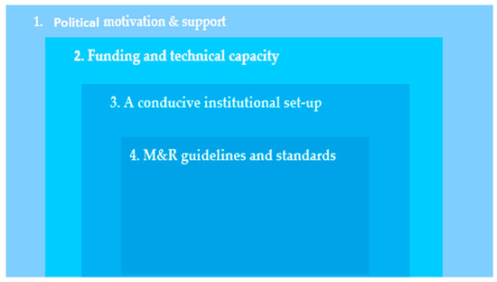 Based on our findings from Georgia and in the literature, we argue that there are at least four main options that can be taken on the national level for enhancing domestic M&R systems, i.e., through (1) political motivation and support; (2) funding and technical capacity; (3) a conducive institutional set-up; and (4) domestic guidelines and standards for M&R. These four elements are summarized in Figure 3, and as it further illustrates, we see these four main options as closely interrelated.