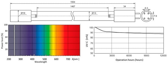 The UV-C system in HVAC is usually in operation for almost the whole year and we design its service life for 100,000 operating hours. Fluorescent lamps are consumables. The optimal lamp replacement cycle is determined by their effective life from 9000 to 25,000 operating hours, when the efficiency in the UV-C spectrum range must not fall below 90%. In addition to the decreasing efficiency of the TUV lamp (tubular UV lamp) itself, the efficiency of the system is also affected by air temperature, dust pollution, and degradation of reflective surfaces in the ventilation ducts. Even with regular maintenance and cleaning, it is necessary to take into account a reduction in the efficiency of the system within service cycles in the range from 10% to 35%, depending on how the system is built and operated. If we need the available power of 8 × 30 W in UV-C in the part of the spectrum 254 nm and take into account the factors reducing efficiency within one cycle of lamp replacement up to 38%, then we use a standard TUV lamp system 8 × TUV 64T5 HO 4P SE UNP/32 (Figure 1) without ozone production with four-pin single ended sockets with a power input of 145 W with power in UV-C after 100 h of operation 8 × 45 W with an adjustable ballast according to the CRO system—constant radiation output.