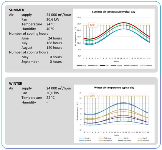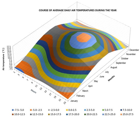- Determination of the course of air temperature and relative humidity of the reference day in the assessed month of summer and winter (Figure 3).