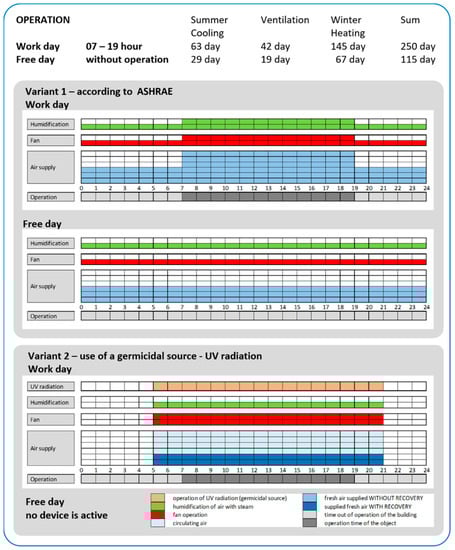 Variant 1—according to ASHRAE, on a working day, the building is operated for 12 h with 100% output for fresh air, without circulation and without recuperation. Other times, the output is reduced to 50%.
