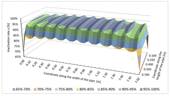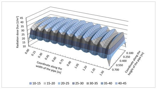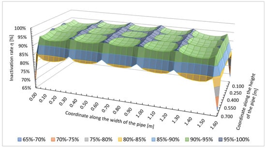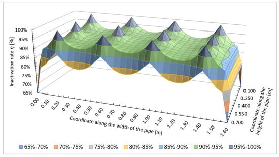 The DUV radiation dose and inactivation rate η curves are shown in Figure 5 and Figure 6 (alt A), Figure 7 and Figure 8 (alt B), and finally Figure 9 and Figure 10 (alt C).