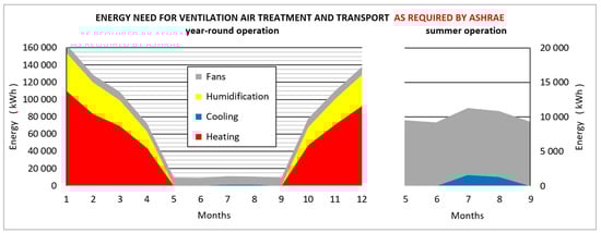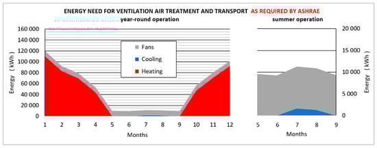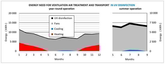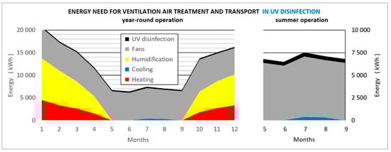 Calculations for year-round operation for variant 1 without humidification are shown in Table 7 and Figure 14 for ASHRAE operation, and for variant 2 in Table 8 and Figure 15 for operation using germicidal sources.