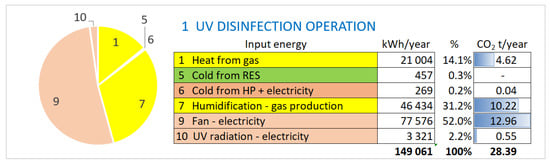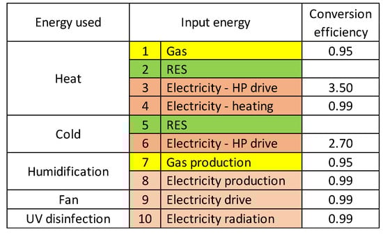 In real conditions, heat and cold for heating are provided by various sources. The impact on primary energy and CO2 emissions is also defined accordingly. Electricity (EE) is used to drive fans and UV germicidal sources. Heat pump with electric drive is used for cold production. Humidification of air is realized by water vapor with the help of gas or electricity. Heat production for heating is by gas, heat pump, or electricity. The energy conversion efficiencies are given in Figure 16 and are taken into account in further calculations in Figure 17, Figure 18, Figure 19, Figure 20, Figure 21 and Figure 22. We used the factors of primary energy and CO2 emissions for conversion according to [16] for Slovakia.
