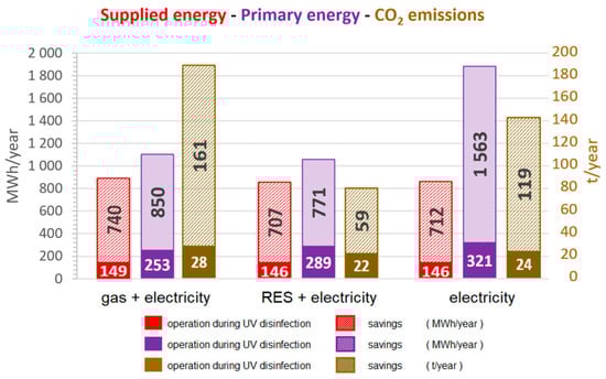 - Comparison of supplied energy Variant 1-3 (858.28 MWh/year) and Variant 2-3 (146.34 MWh/year) difference is savings = 711.94 MWh/year = 82.9%. When comparing CO2 savings = 83.0%.