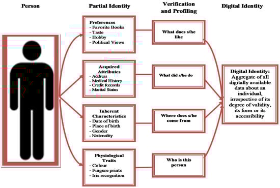 In effect, what is being disclosed is the identity of the user of the social media, which refers to the qualities and characteristics that make an entity definable, distinguishable, and recognizable compared to other entities [60]. Or as Bellini et al. [11] describe it, identity consists of a set of information associated with a specific entity and it is usually a reflection of what is generally known by those with whom they interact [61]. That entity or agent may be a person or individual, organization, application, or device that exists online. Additionally, Bellini et al. observe that when it comes to enabling the virtual world, nothing is more important than identity in explaining the depth of human behavior [11]. Identity management therefore becomes the cornerstone of Internet infrastructure to ensure that not only expectations are being met in terms of service and functionality but also security, privacy, and reliability. Identity in the digital world is digital records that represent a user which are usually saved and managed in a standard format by entities that provide those identity information. The concept of identity is therefore vital in the formation of better knowledge of people and in trust building, since it provides the foundation for socio-economic interactions. Such definitions have widened the concept of identity to include identifiers such as login names and pseudonyms. Identity in information systems therefore consists of peculiar traits, attributes, and preferences that used to provide personalized services to users [62]. Such tweets, posts, likes, email trails or tags produce a digital footprint that can be connected perpetually to users digital identity [63]. Such digital footprints usually released during user interactions and exchanges on social media are sometimes referred to as digital personas or partial identity, as illustrated in Figure 1 [64].