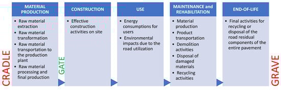 For the definition of the system boundaries, first it is fundamental to consider the entire life cycle of asphalt pavements, from production to disposal. In general, it is possible to identify five different stages in the pavement life cycle, as shown in Figure 1.