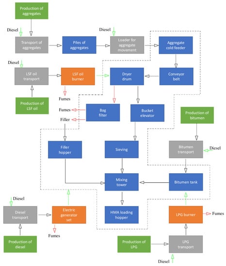 Concerning energy needs for production, different fuels and energy sources were considered for the plant equipment and parts. Indeed, the largest energy contribution is assured by power energy, used for general plant operation and for internal material movements (conveyor belts, bucket elevators, etc.). Since there is no direct connection to the grid, a diesel engine produces the required energy in the analyzed plant. For aggregate drying and heating, a powerful LSF oil burner is adopted, while the bitumen is heated by means of an LPG burner. Finally, a wheel loader allows operators to load the various aggregate components in the cold feeder and, thus, this requires other diesel consumption. A representative scheme of the processes and elements involved in the production activity is shown in Figure 2: in detail, the main plant elements are depicted in blue, while transport processes are in gray; activities for production of components and fuels are in green (related information was extracted from secondary data).