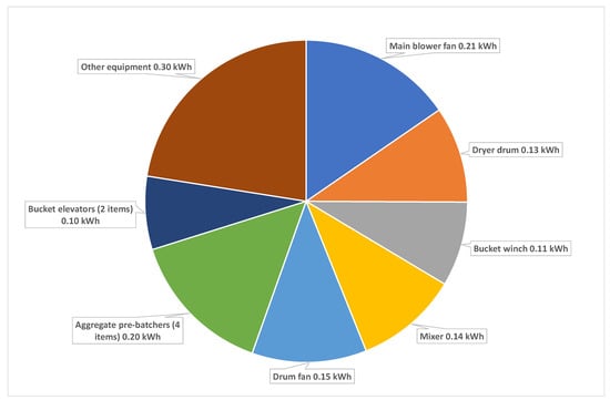 Furthermore, for a more accurate electrical analysis of the plant, the main elements were equipped with ammeters for continuous electricity measurements, during the production phases. The acquired measurements were used to calculate the required electricity for the DU, as shown in Figure 3. As mentioned, the overall plant involves a total electric power (including also secondary equipment and devices) of around 100 kW in normal operations, as evaluated by the plant direction. Consequently, the total required power energy for the DU is equal to 1.35 kWh, corresponding to 4.86 MJ/DU.