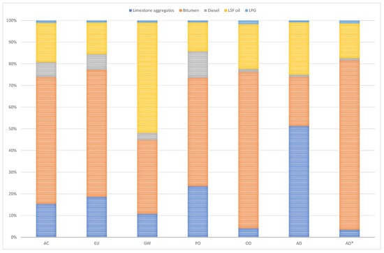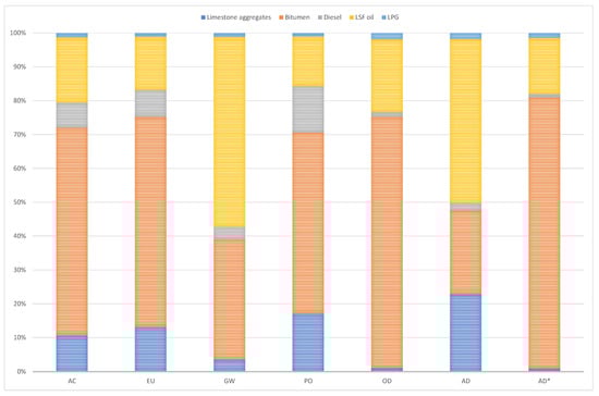 The analysis of the numerical outcomes evidences the most relevant components in the production of the DU of HMA mixture in a batch-mix plant. First, it appears that bitumen is the most relevant contributor to total impacts, almost for all categories, except for GW (Figure 6). Its incidence varies from 23% (AD) to 78% (AD*). LSF oil causes the main impact (51%) on GW while virgin aggregate consumption has the higher influence (51%) on AD. A negligible contribution (lower than 2%) comes from LPG for all the examined impact categories and from diesel for the impacts on global warming, ozone depletion, and abiotic depletion.