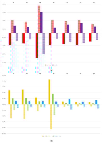 Impact variation for the examined scenarios: (a) scenarios A+, A−, E+, E−; (b) scenarios B+, B−, C+, C−, D+, D−.