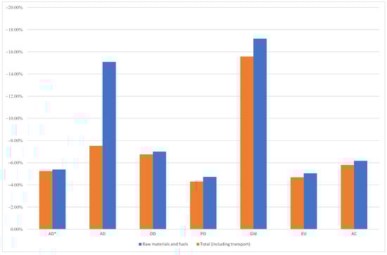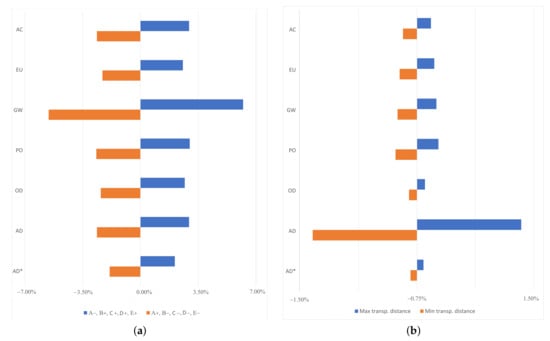 Further, transportation distance was also numerically tested. In particular, for components with alternative providers, the effect of transportation distance maximization (and minimization) has been studied. As underlined in Section 3, bitumen and diesel are generally alternatively provided by two different production plants located in two different areas of Sicily (Figure 4, Table 2). In previous calculation, thus, the average distance was taken into consideration. In order to quantify possible effects of distance variations (even for these two components only), Figure 8b provides the variations for the various impact categories when both components are bought from the farther or the closer plant. AD results as the most influenced impact, with a positive or negative 1.35% change in the two cases. Although it seems that, compared to reference impacts of Figure 6, these variations are not relevant, it should be considered that passing from the farthest to the closest providers determines about 3% reduction in AD, confirming the advantages for limiting transportation distances.