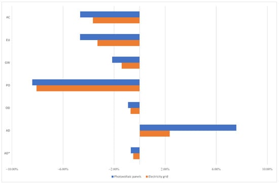 The provided results generally confirm a noticeable improvement in the sustainable performance of the selected production plant. From a global perspective, despite a not negligible increase of AD—especially for the photovoltaic panels—the two alternative ways of feeding energy assure important reductions for all the selected impact categories. PO is the most reduced category, with a peak around 8% for both solutions, followed by AC and EU (around 5% reduction for photovoltaic panels and 3% for the grid). However, in both cases, AD shows a remarkable increase, but this is substantially due to the specific reference technology. In particular, for the photovoltaic panels, AD is mainly related to the rare and precious minerals quantities required for panel production []. In summary, despite this aspect, the choice of a different source for electricity supply appears convenient from an environmental perspective, assuring improvements for the considered impact categories. Also taking into account the avoided impacts due to the diesel transportation (Figure 10), an increase in AD is observed as well as a higher decrease of the other impact categories. This result further confirms the improvement achievable by substituting electricity from the diesel-based generating set with electricity from the grid or from photovoltaic.