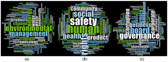 In managing their environmental impact, businesses are assessed on the overall life cycle and sustainability of their products and services; the efficient use and protection of (natural) resources; and the prevention and control of pollution and emissions (including climate change and GHG emissions). The evaluation of social responsibilities of businesses comprises employee working conditions (e.g., health and safety) and human capital development (e.g., training and education); labor rights, non-discrimination, and equal opportunity; human rights, community involvement, and philanthropy; and customer responsibility, product quality, and safety. Corporate governance is indicated by considering business conduct, business ethics, and governance structures; shareholders’ rights, board structure, and remuneration; the prevention of controversial practices, bribery, and corruption; and audit, disclosure, and transparency in reporting. For a graphical representation of the underlying themes found within each of these three domains and the relative frequencies of their mention, see Figure 2.