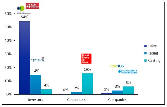 Overview of which target audience (investors, consumers, companies) is considered by rating agencies broken down by indicator type (index, rating, ranking).